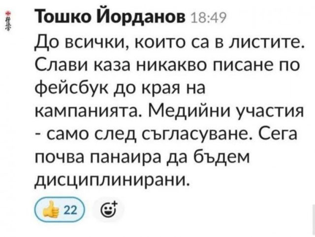 „До всички, които са в листите. Слави каза никакво писане по Фейсбук до края на кампанията. Медийни участия-само след съгласуване. Сега почва панаира да бъдем дисциплинирани“, заповядва Йорданов.