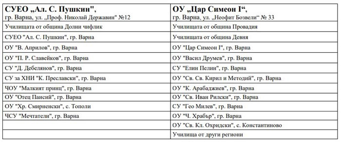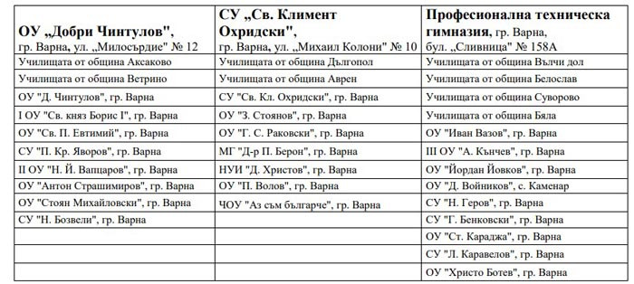 В случай, че седмокласникът и родителите му нямат възможност самостоятелно да подадат документите по електронен път, трябва да посетят някое от училищата, определени като центрове, където могат бъдат обработени заявленията. Тази година документи на ученици за участие в класиранията ще могат да се подават в следните варненски училища: ОУ „Добри Чинтулов“, ОУ „Цар Симеон І“, СУ „Св. Климент Охридски“, СУЕО „Ал. Сл. Пушкин“, Професионална техническа гимназия. Ето какво е разпределението: