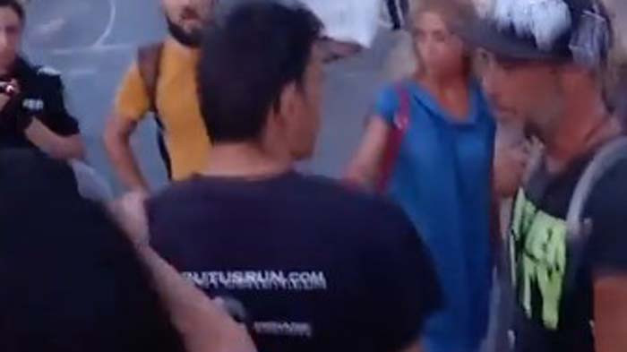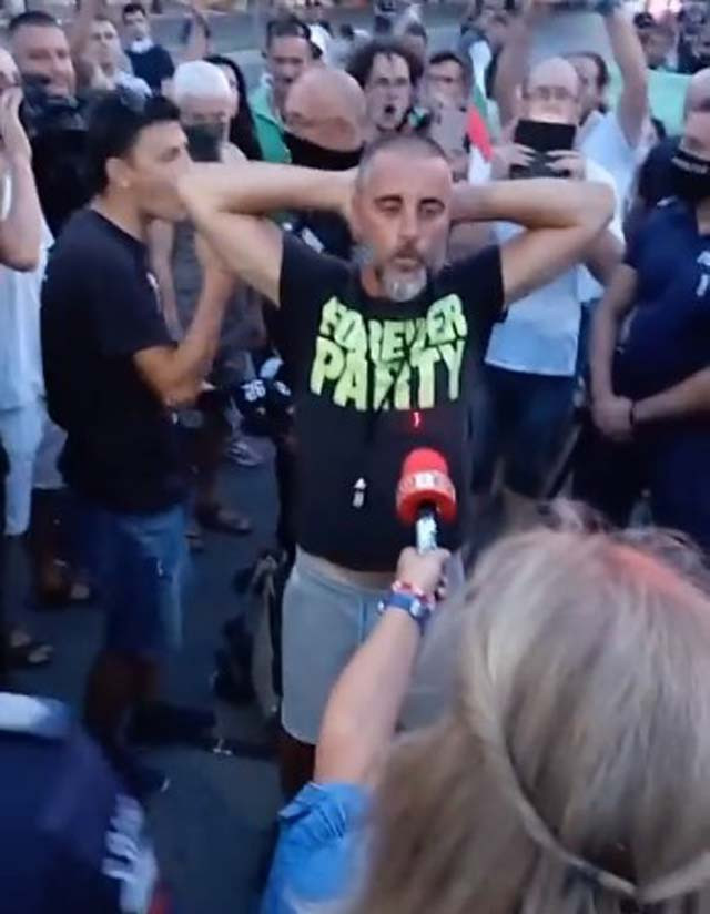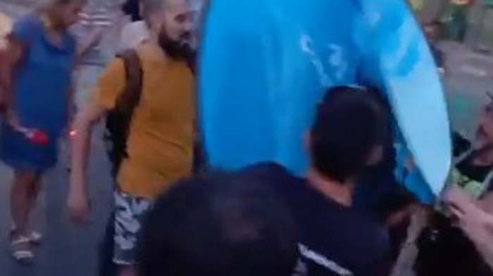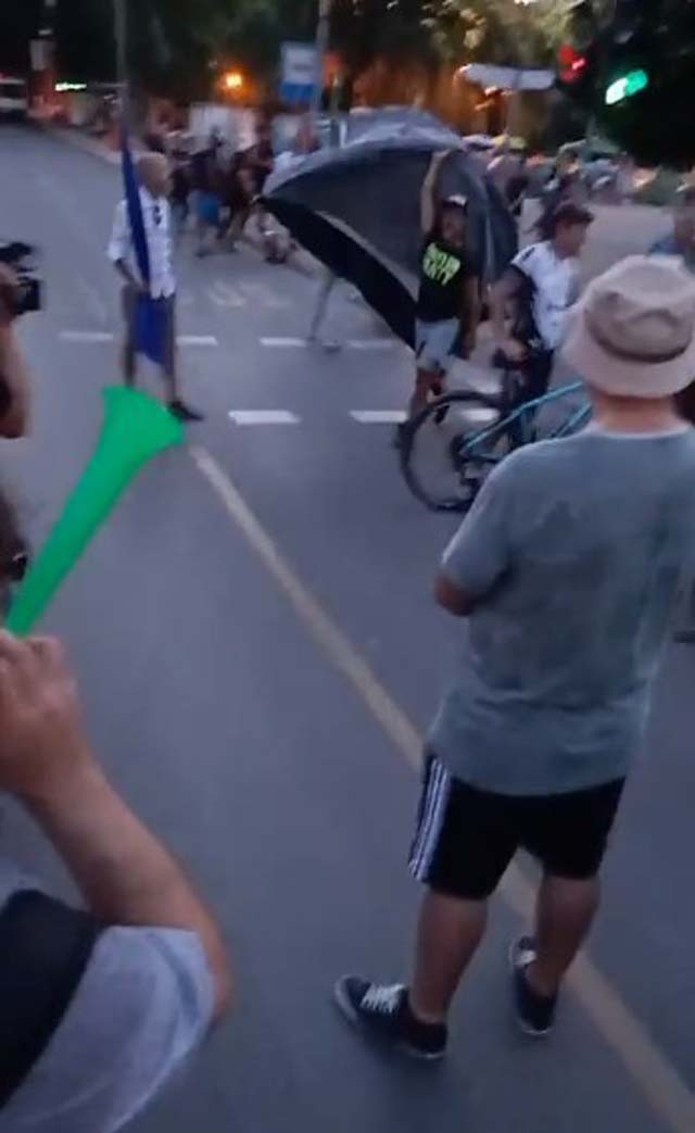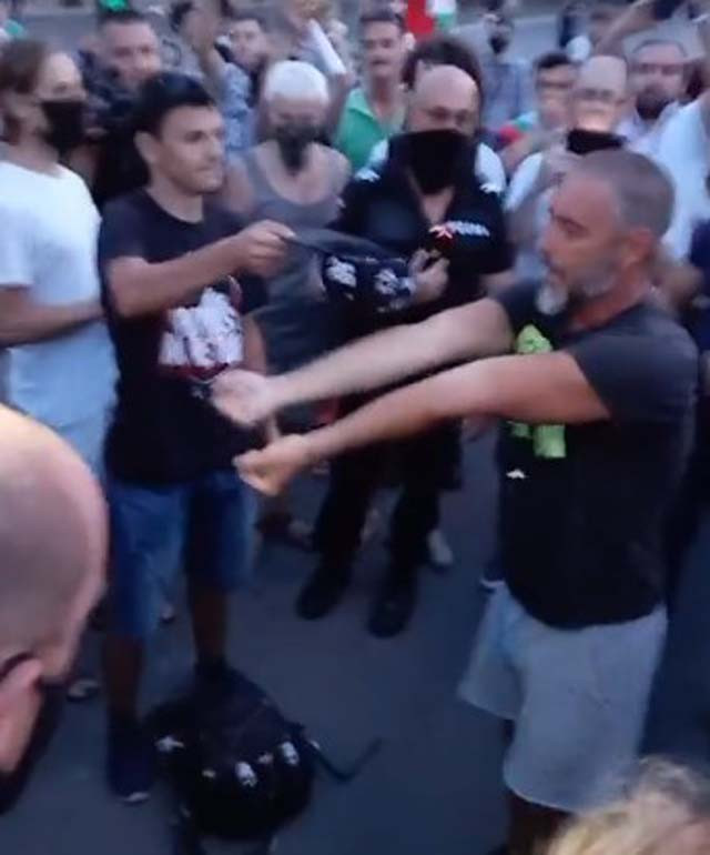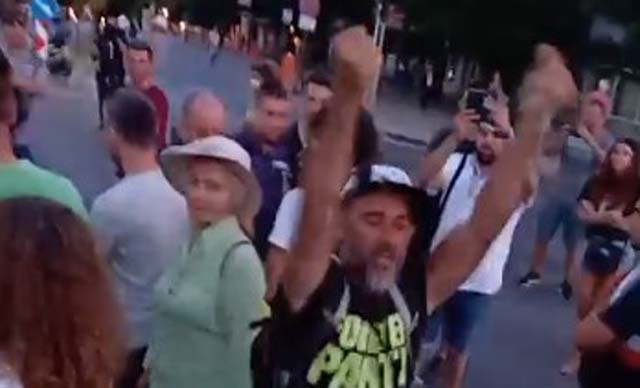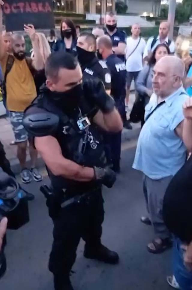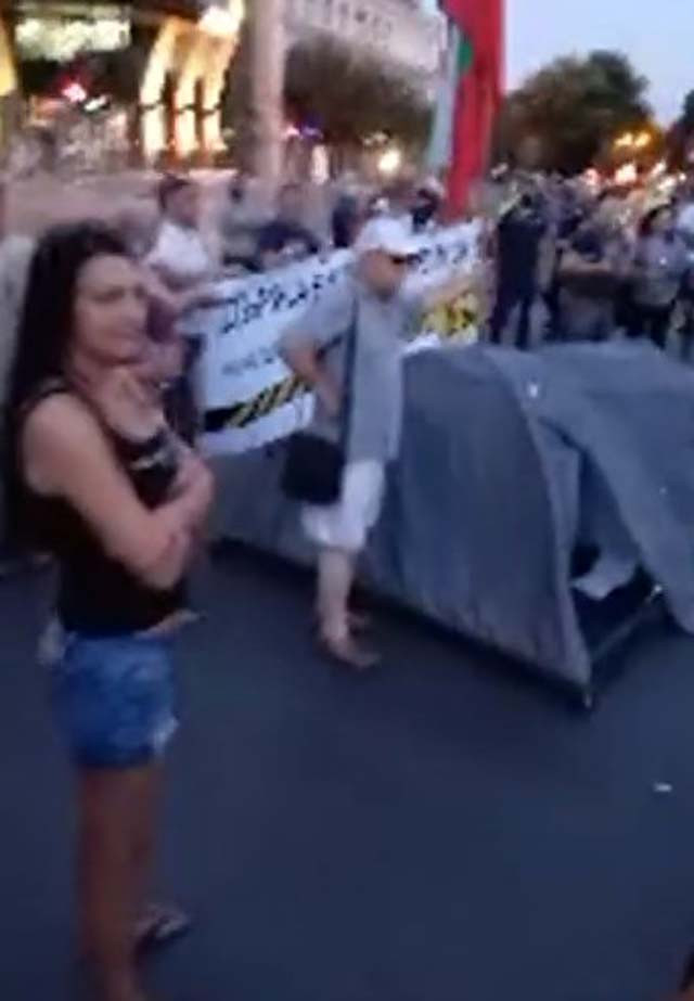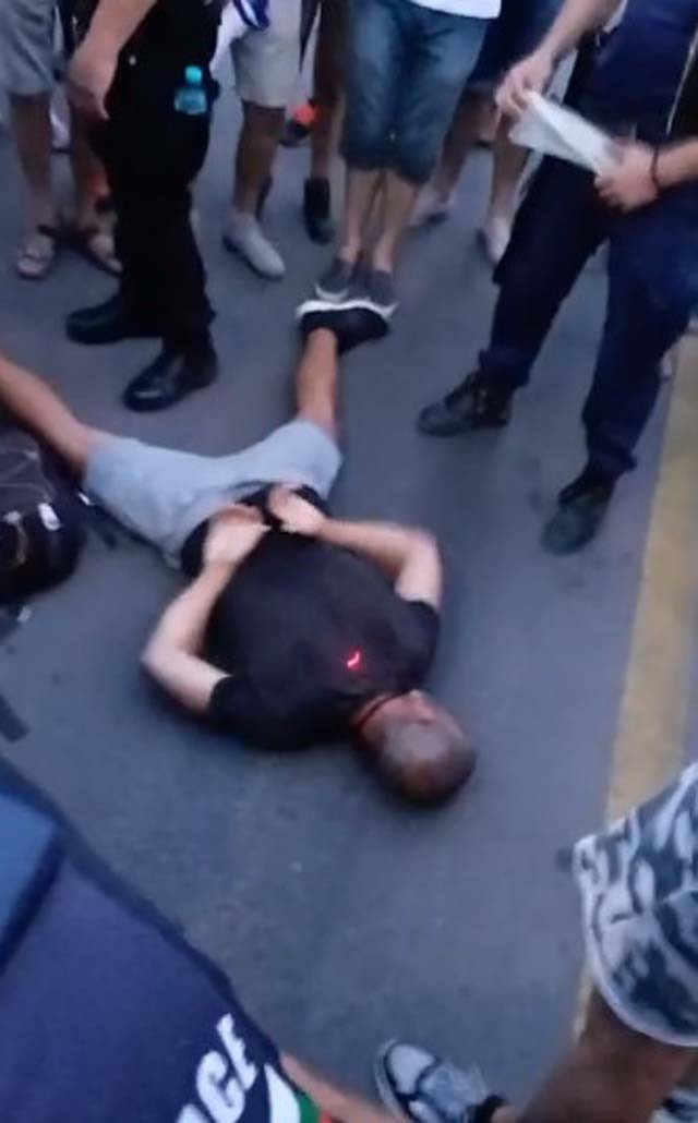 Една жена го моли да стане от земята, а протестърът все така упорито лежи на земята и крещи, че е готов да бъде арестуван.