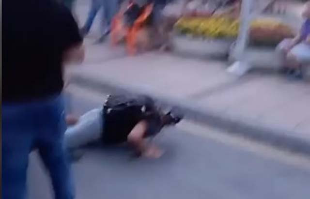 Един от протестиращите клоунски се просва по очи на земята, може би в опит да внуши, че полицай го е бутнал. Ясно се вижда, че всичко е зле изиграна клоунада.