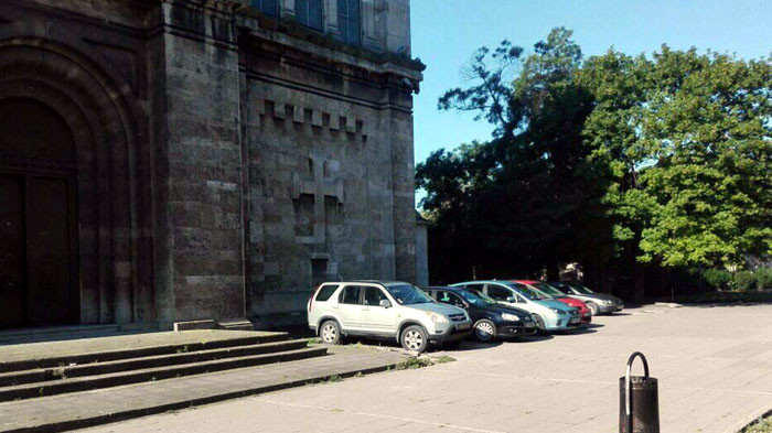 На това място паркинг не е обособен, а автомобилите са паркирали от двете страни на стълбите към храма, на място, което се води пешеходна зона.