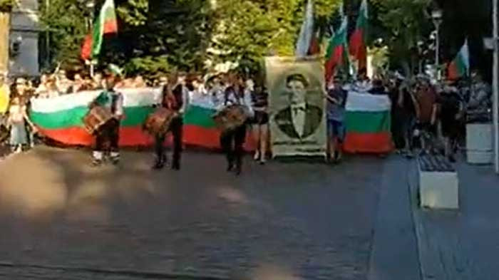Тълпата се води от трима тъпанджии, спретнати в народни носии, съпровождани от свирки. Политическото тумба не се посвени да включи в маршрута си и паметника на Васил Левски. След като бяха освиркани от проруските партии, от „Демократична България“ буквално свиха знамената – европейски флагове няма!