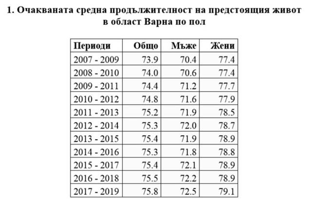Средната продължителност на живота при мъжете в област Варна е 72.5 години, докато при жените е с 6.6 години по-висока - 79.1 години. И при двата пола равнището на показателя за периода остава по-високо от регистрираното средно за страната.